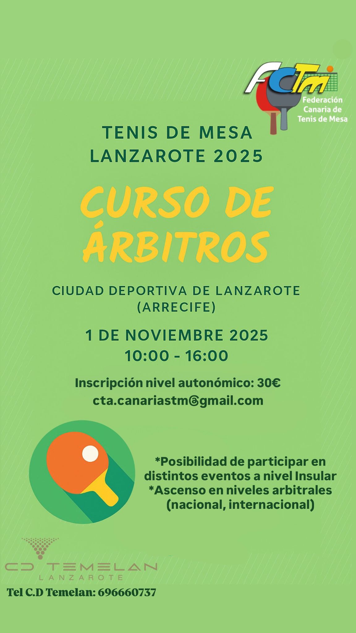 La Federación Canaria de Tenis de Mesa y el CD Temelan organizan un curso de árbitro de nivel autonómico el 1 de Noviembre de 2025 (10:00 a 16:00) en la Ciudad Deportiva de Lanzarote (Arrecife).